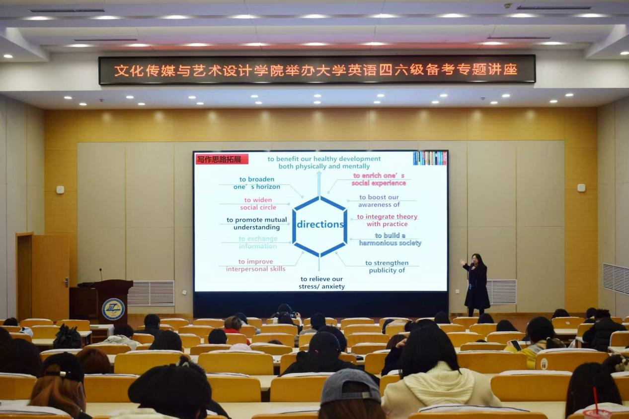 为帮助同学们高效备战大学英语四六级考试,提升英语综合应用能力,4月8日下午,文化传媒与艺术设计学院在学校党员教育培训中心举办了大学英语四六级备考专题讲座。讲座由产品设计专业241班苏湘婷主持。