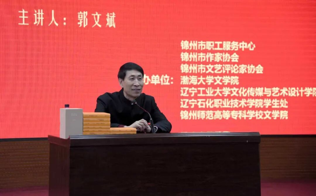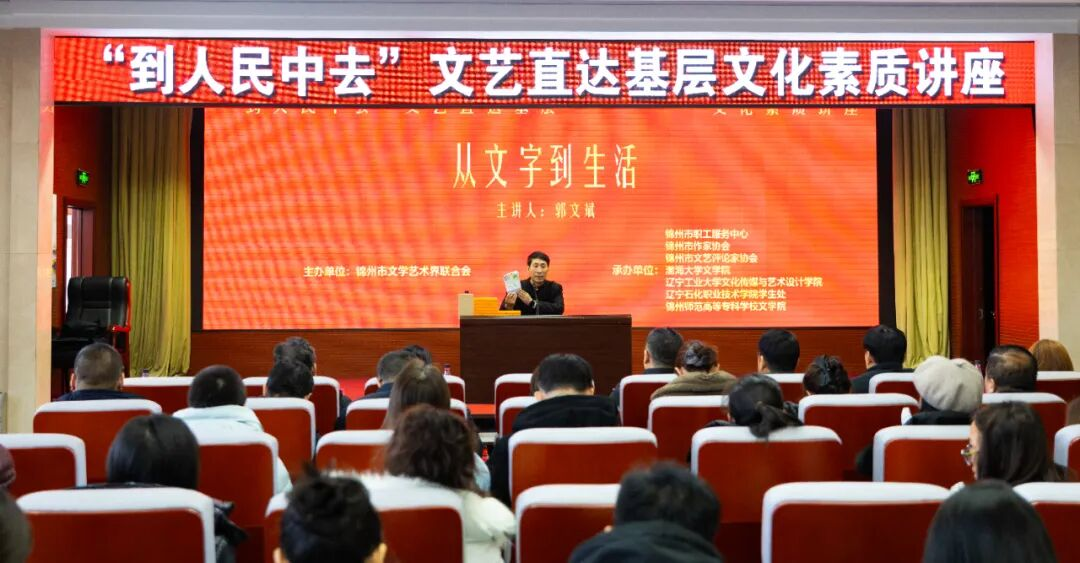 寒冬蕴暖意,文艺润民生。为深入学习贯彻党的二十届四中全会精神,推动中华优秀传统文化创造性转化、创新性发展,让优质文艺资源直达基层,12月17日,由锦州市文学艺术界联合会主办的“到人民中去”系列活动特邀宁夏文联主席、宁夏作协主席郭文斌担任主讲。此次活动为我市作家、评论家,高校师生和文学爱好者带来一场深刻而温暖的精神滋养。我院部分教师、新闻与传播专业硕士研究生参加了本次活动。